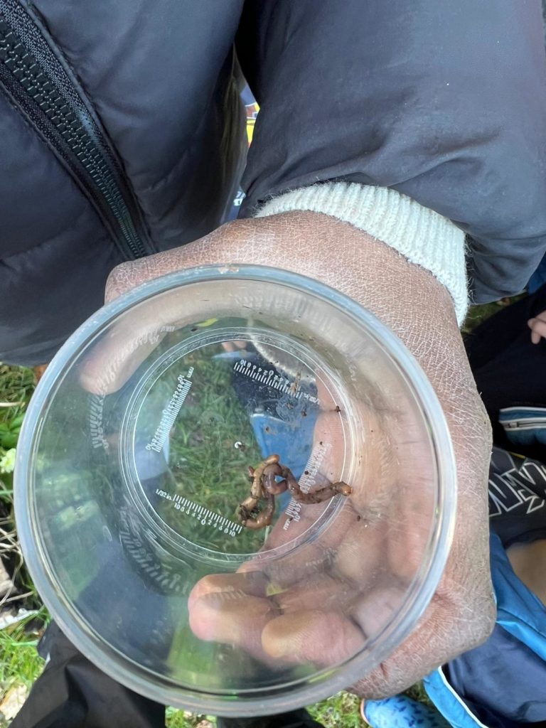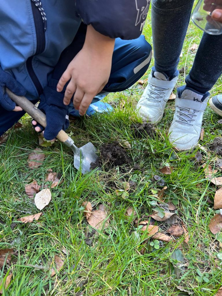 Ensuite, nous avons fait un trou avec une pelle dans la forêt afin de vérifier leurs représentations. Les élèves étaient enchantés. Pas facile de collaborer pour savoir qui commence et qui continue. Ils ont trouvé de la terre, des vers de terre, des cailloux et des branches. En classe, nous avons visionné la vidéo « ma planète chérie » pour en apprendre davantage et voir comment se compostent les feuilles des arbres