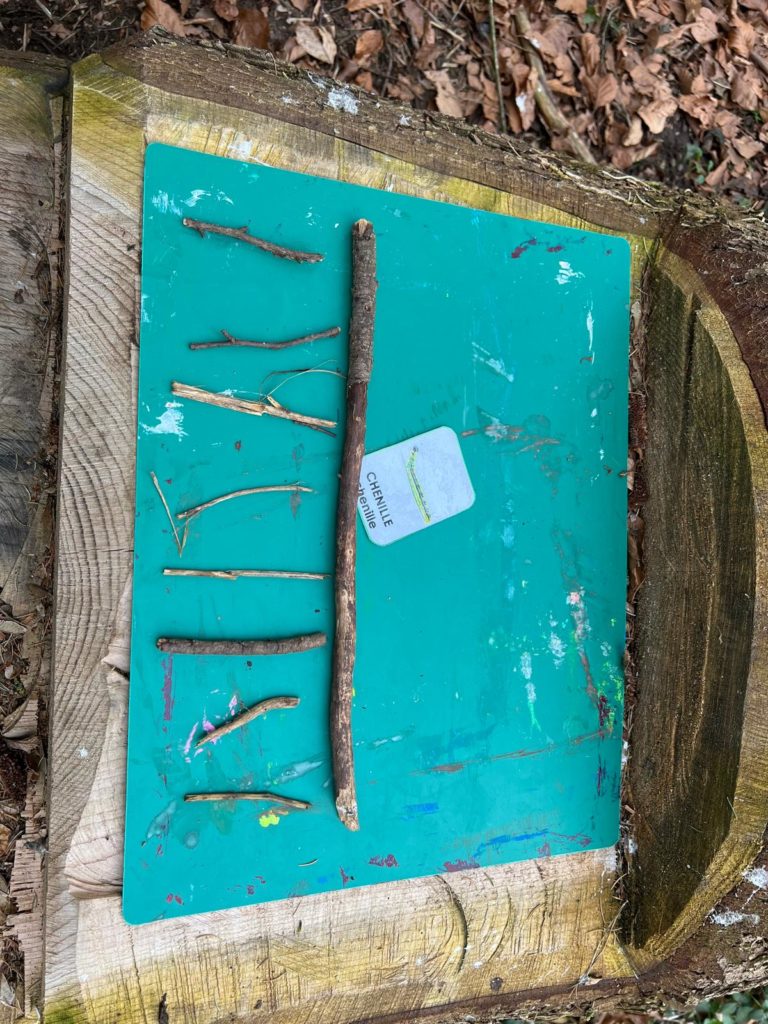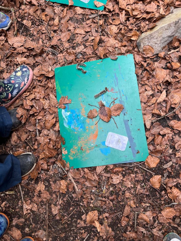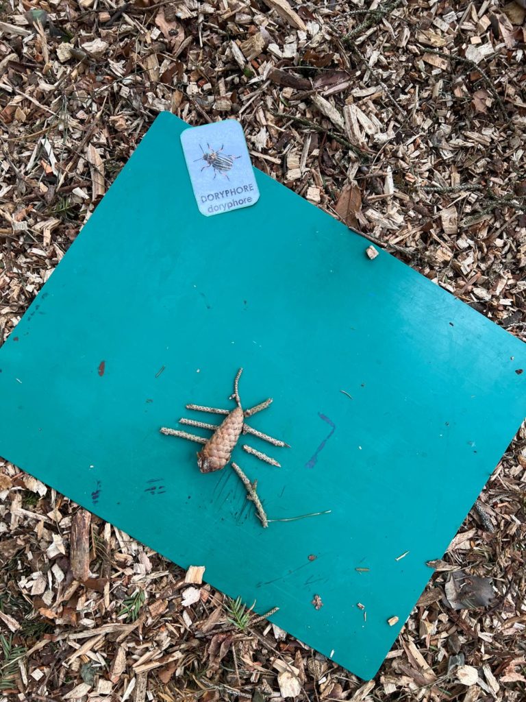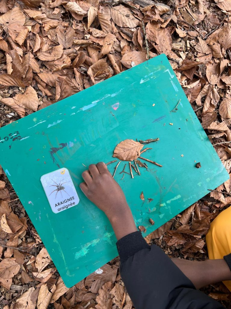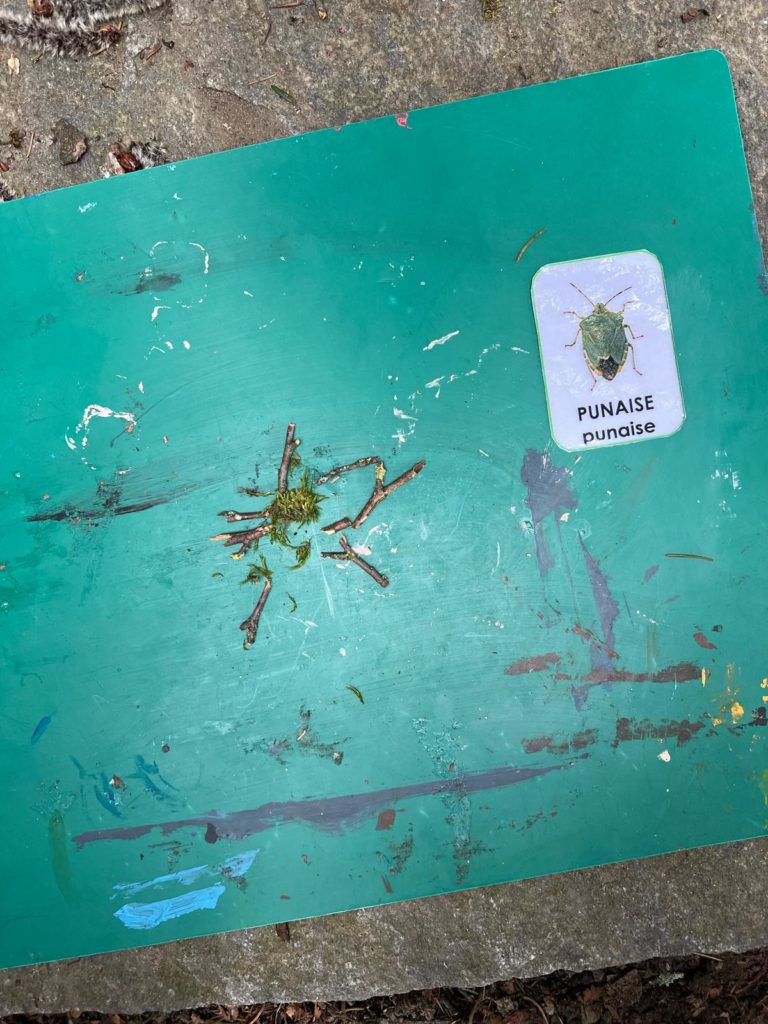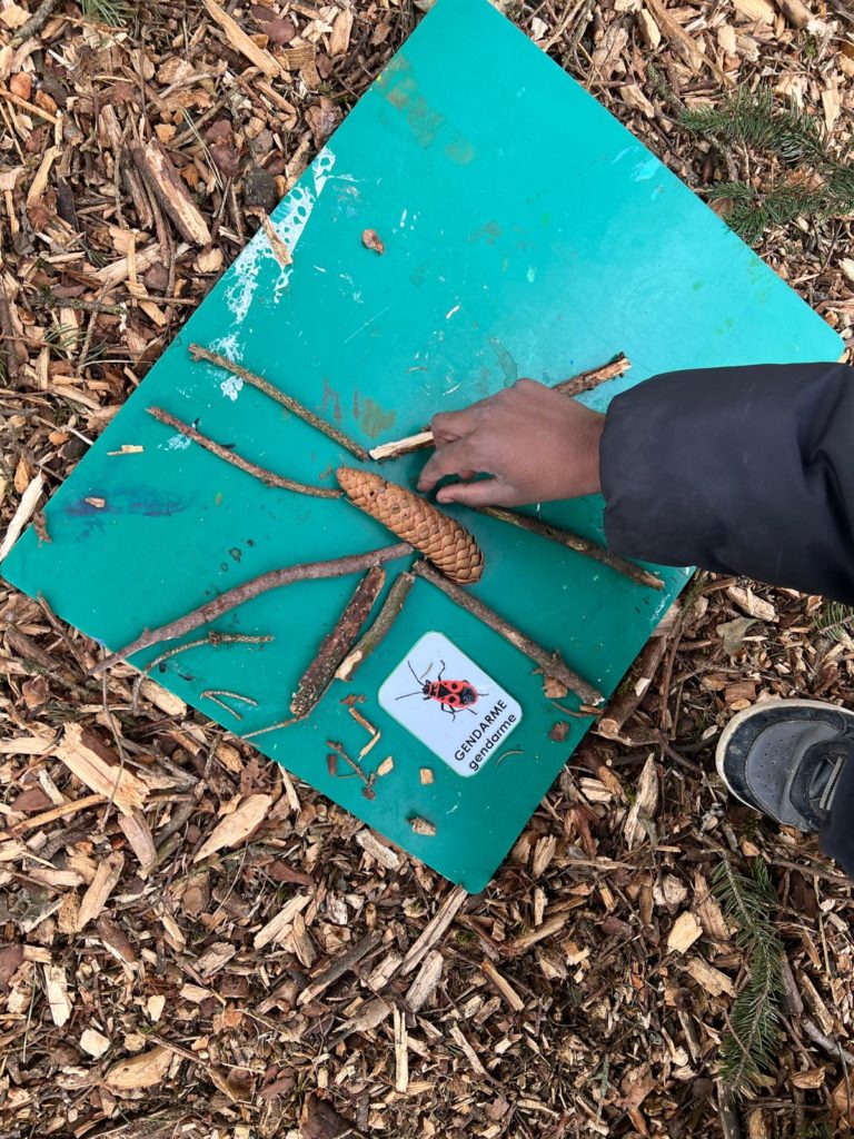 Par la suite, chaque enfant a fait un land art avec les objets de la nature pour représenter une petite bête : chenille, araignée, scarabée, … Les enfants se sont montrés très créatifs.
