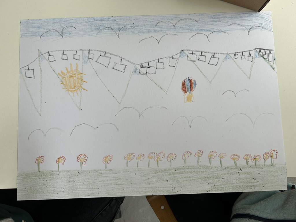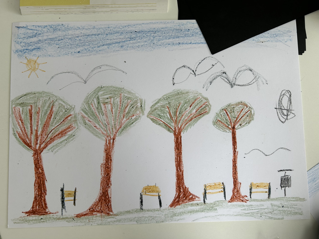Deux dames nous ont appris à utiliser les tampons. Nous avons fait des dessins en commun avec des néocolors fabriqués avec des éléments de la nature (cire d’abeille et pigments naturels). Cette activité nous a appris beaucoup de choses, par exemple qu’on peut faire des dessins avec la nature.
