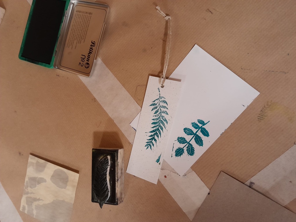 On va vous présenter l’atelier « tampons » auquel on a participé. Les tampons étaient faits à la main par la technique de la gravure et on a pu les utiliser et les tester pour faire des dessins, des marque-pages et d’autres choses.