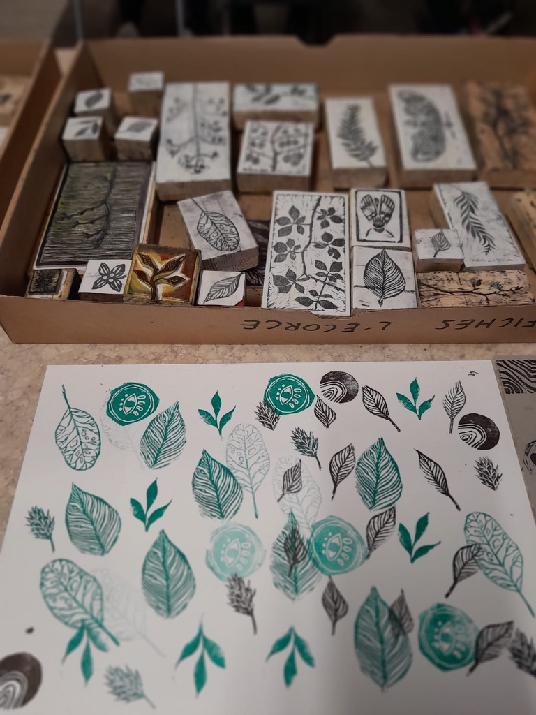 On va vous présenter l’atelier « tampons » auquel on a participé. Les tampons étaient faits à la main par la technique de la gravure et on a pu les utiliser et les tester pour faire des dessins, des marque-pages et d’autres choses.