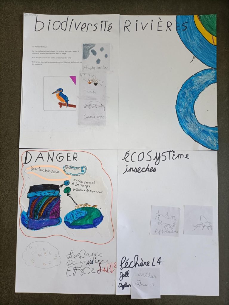 Dans le cadre de la semaine du climat, nous avons fait des panneaux pour représenter trois écosystèmes : zone agricole, rivière, lac. Nous avons présenté la faune, la flore et les dangers qui menacent ces milieux. Les flèches représentent les liens.
