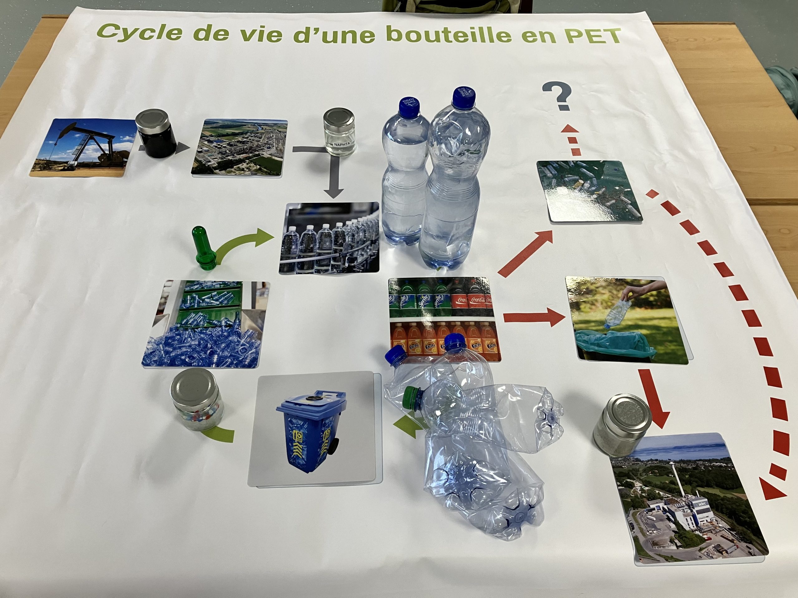 Il y a deux jours, durant un atelier sur le PET animé par l’association COSEDEC, on a d’abord analysé le cycle de vie des bouteilles en PET. D’ailleurs, PET est un acronyme pour polytéréphtalate d’éthylène. On a appris qu’il fallait extraire du pétrole et le raffiner pour produire du PET. Lors de chaque recyclage, seul 60% de la matière est récupéré. Le reste est utilisé dans des domaines qui ne sont pas alimentaires, comme pour fabriquer des vêtements ou des chaussures.