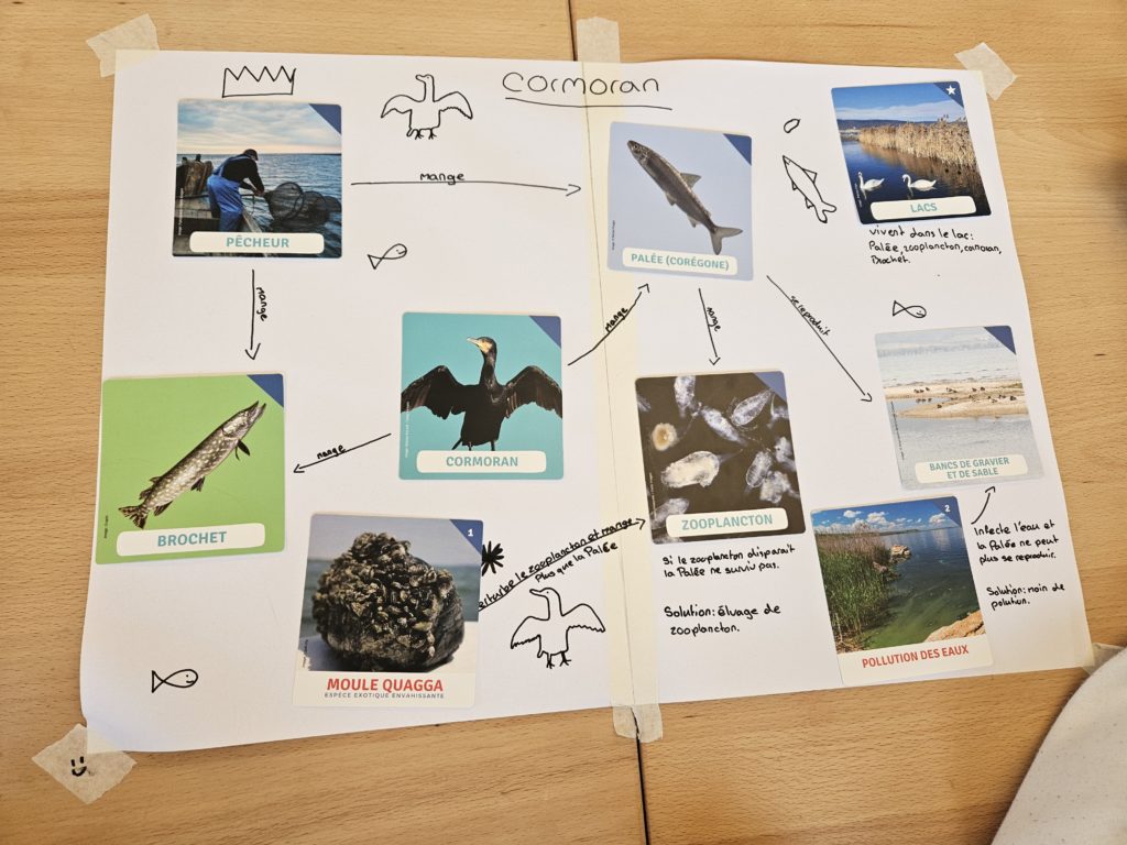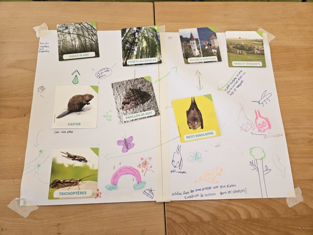 Mais l’enquête ne s’arrêtait pas là : une fois les écosystèmes bien compris, chaque groupe a ensuite reçu une perturbation affectant son écosystème (pollution, déforestation, introduction d’une espèce invasive, etc.) et a dû proposer des solutions concrètes pour limiter les dégâts sur la biodiversité. À l’aide de dessins, schémas ou présentations sur une affiche, les élèves ont mis en image leurs découvertes et leurs idées.
