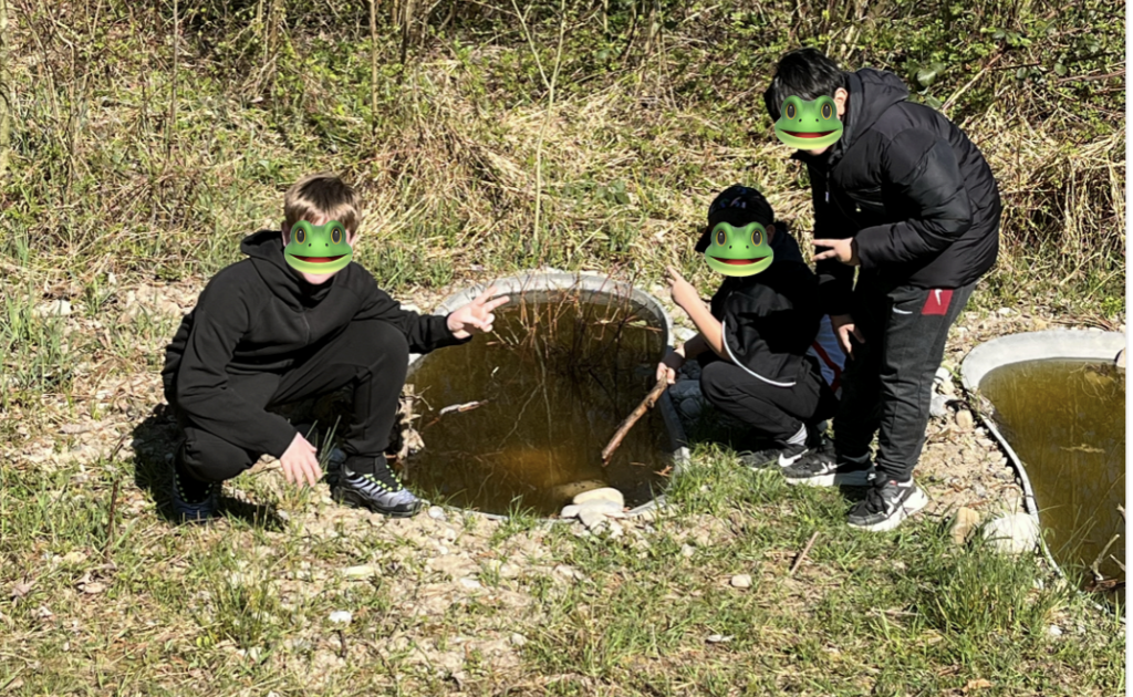 🎉 Sechs Monate später war es dann so weit: In drei der Wannen haben wir richtig viele Kaulquappen entdeckt! Es gab so viele, unmöglich alle zu zählen! Das war ein tolles Gefühl – unser Einsatz hat sich gelohnt! Leider sind ein paar Wochen später aber auch viele Kaulquappen gestorben, und wir wissen nicht genau warum. Vielleicht war das Wasser zu heiss, es gab zu wenig Sauerstoff oder andere Tiere haben sie gefressen. Wir hoffen nicht, dass es wegen dem Abfall ist, denn leider werfen Leute immer wieder Abfall in den Wald 😢.